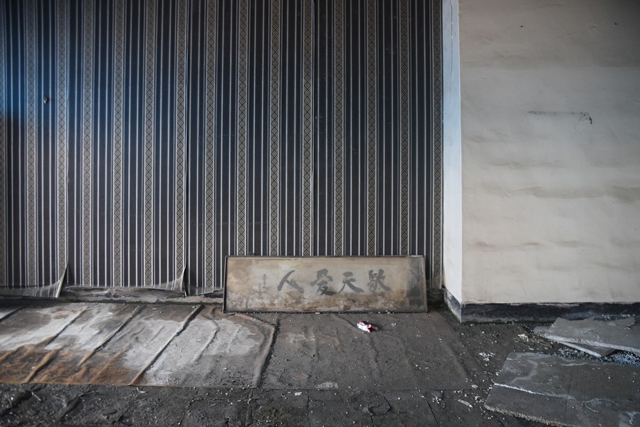 Inside the front entrance, I found this table set up seemingly as a barricade.