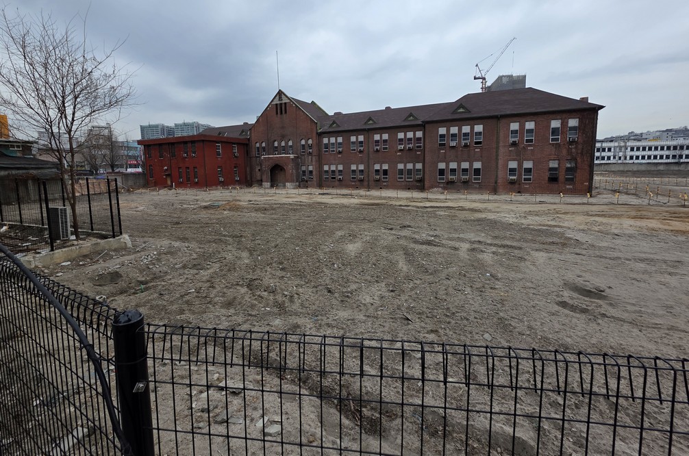 I stopped by this historic school in Dongdaemun, curious to see if the construction hoarding had given up any entry points. It turned out that fencing had been removed, and there was now a flimsy mesh fence around the site. I didn't get closer, but...I could.