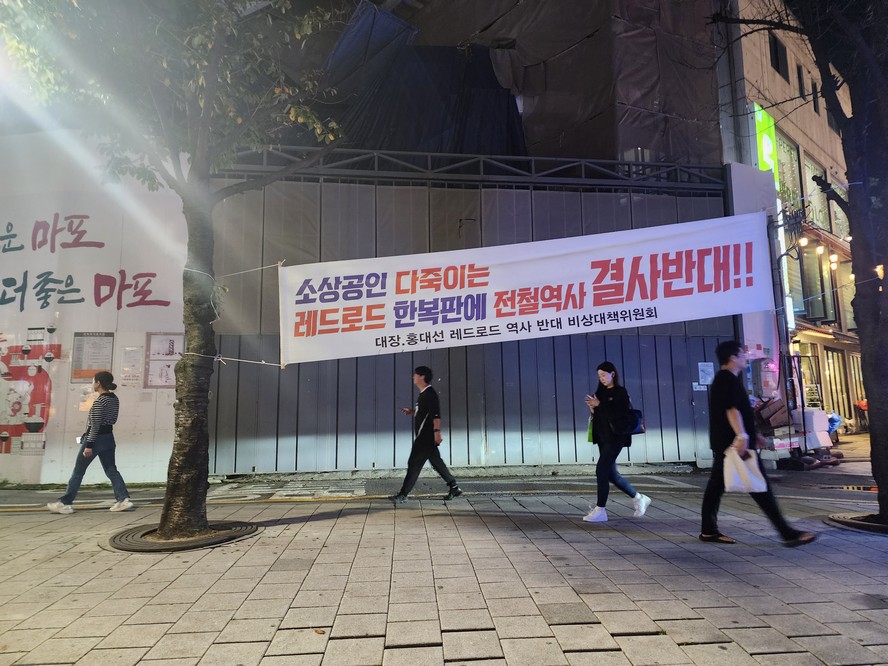 Apparently they're against the opening of a subway station here. I'm not even sure what line. There's going to be a Hongdae Line?