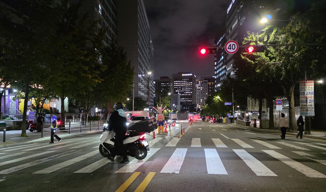 I got a picture of this scooterist magically becoming an honorary pedestrian, right in front of a cop. My original intent was to get a photo of the cop standing with the signal mannequin, but he moved.