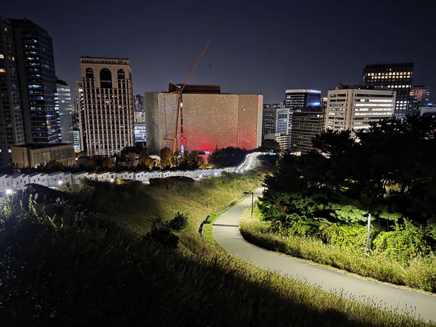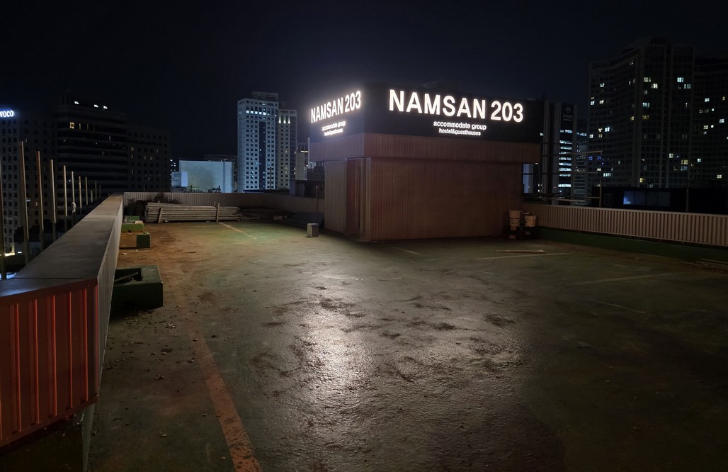 I thought I saw a light on top of the Hilto, so I went up to try getting a peek. Not sure what I saw, because it was on the far edge of the roof from here. Also, it appears there are lights on inside.