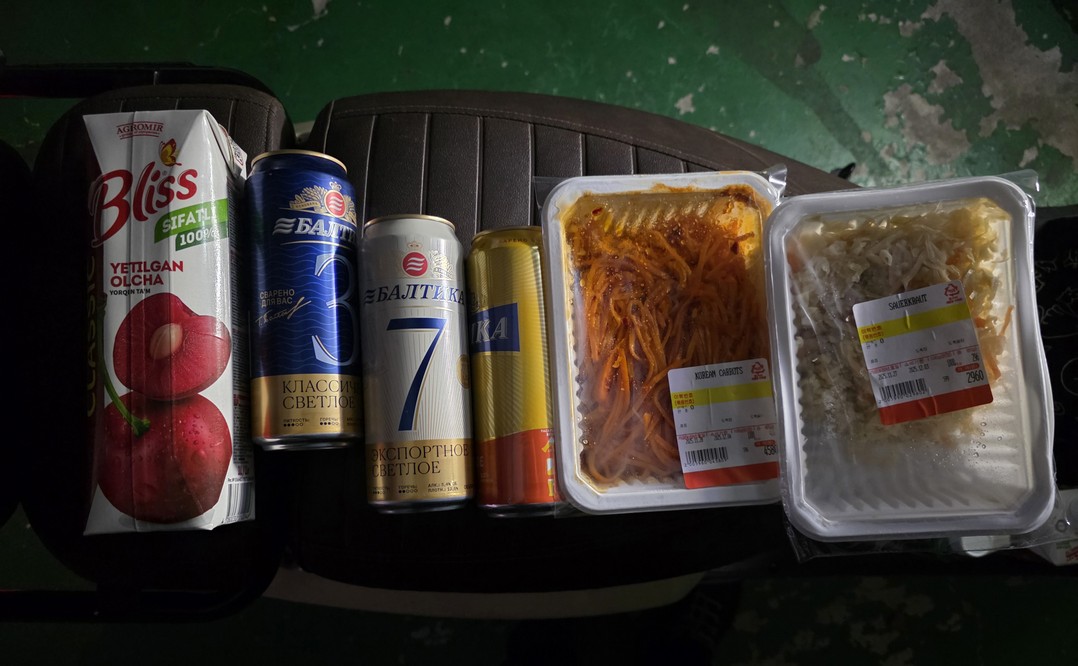I took this photo to show Jeff what I was bringing. The cherry juice ended up going fast, the Baltika 3 disappeared before I drank it, and I assume the Korean carrots and sauerkraut found their homes inside people's stomachs.