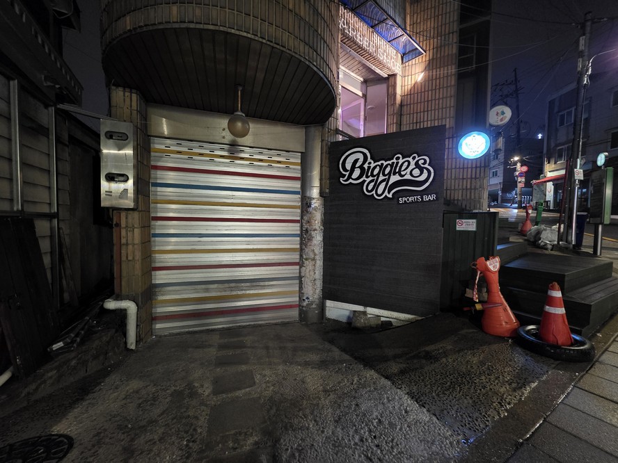 Our first concrete sign that something is happening to the former grocery store at the curve in Sinheung-ro. The sign "Biggie's" is up.