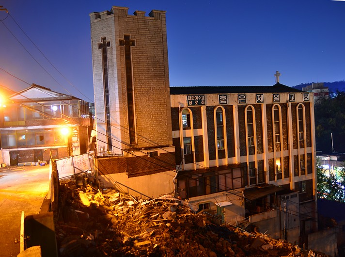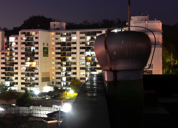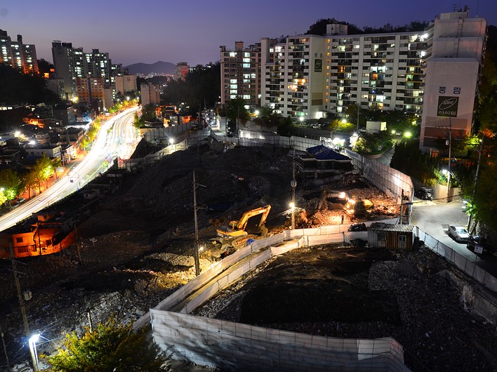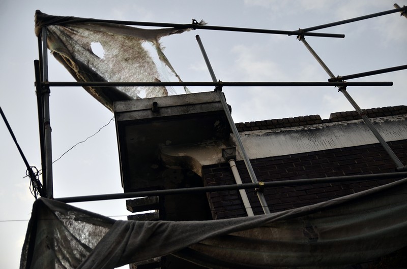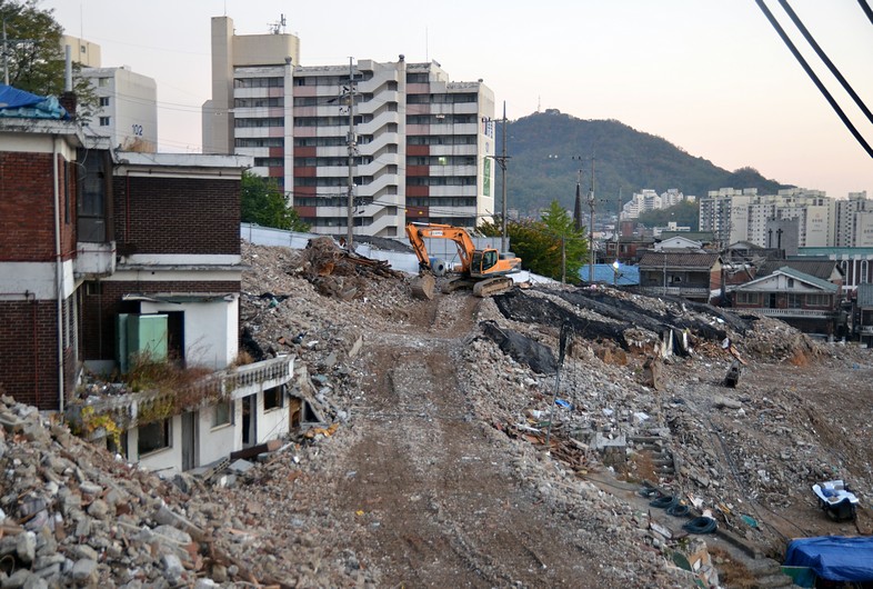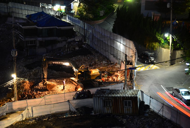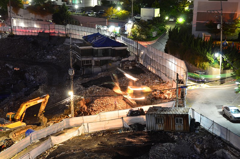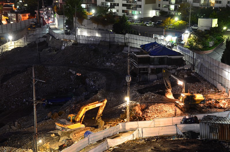 I spent a lot more time up on a nearby rooftop surveying the damage. Not sure why they were using the excavator so late.