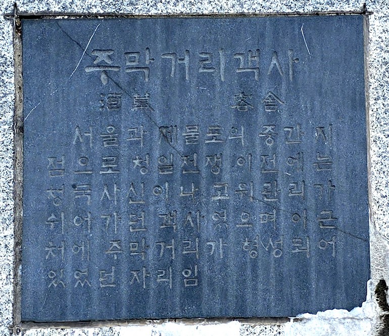 BrokeGPT says: "This was a lodging place (gaeksa) used as a rest stop for government officials and envoys traveling between Seoul and Jemulpo before the outbreak of the Sino-Japanese War. A jumak (tavern) street formed in this area."