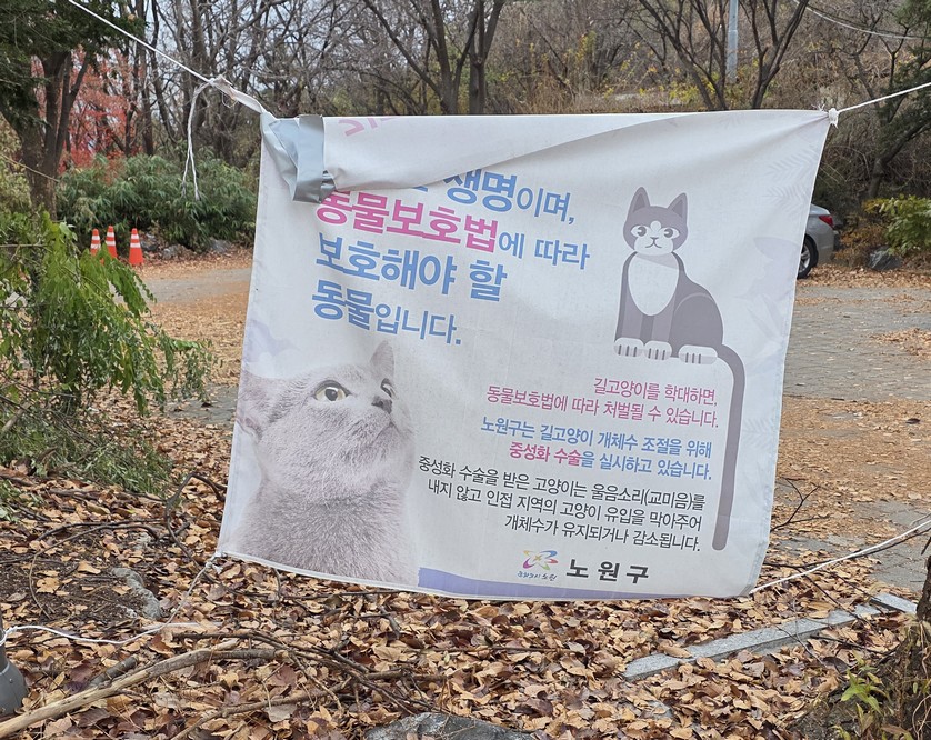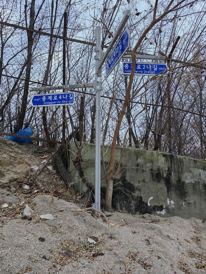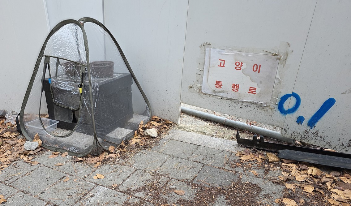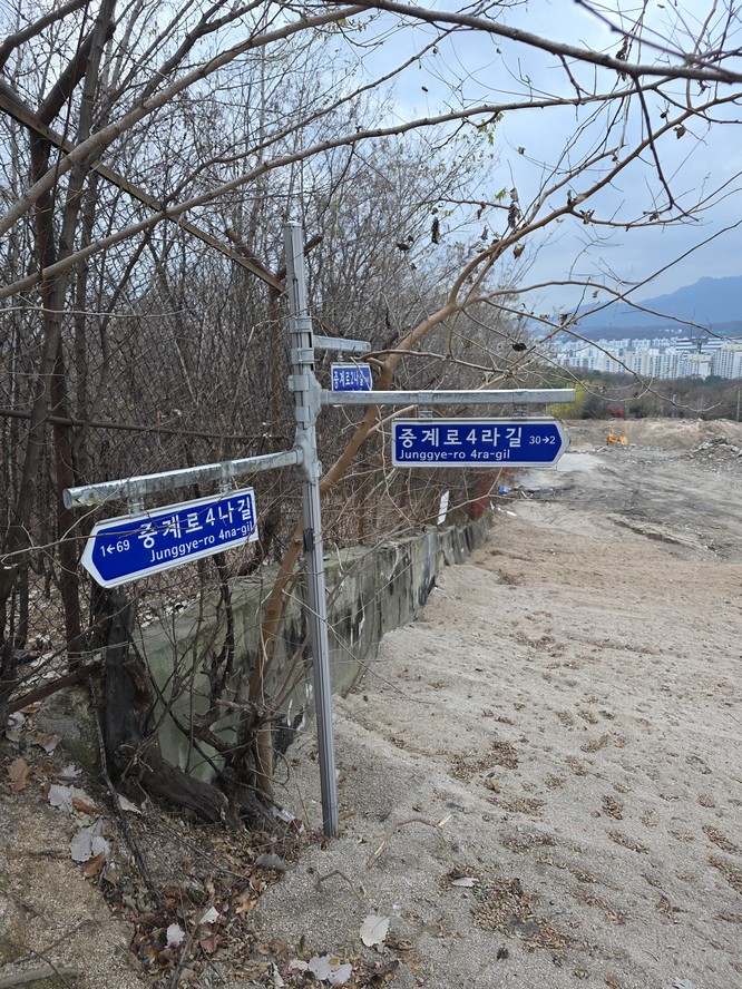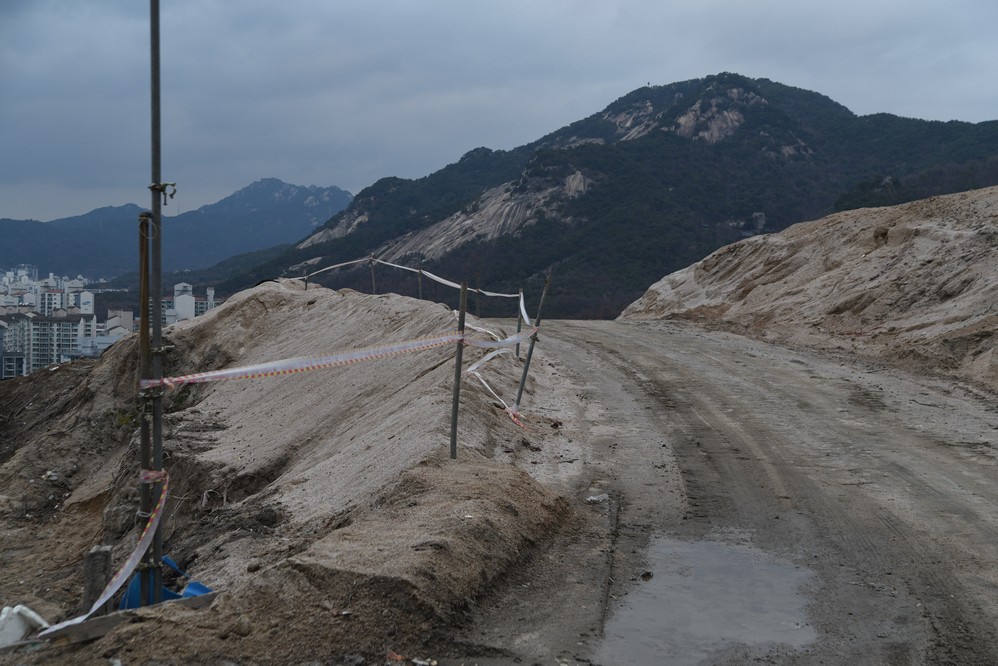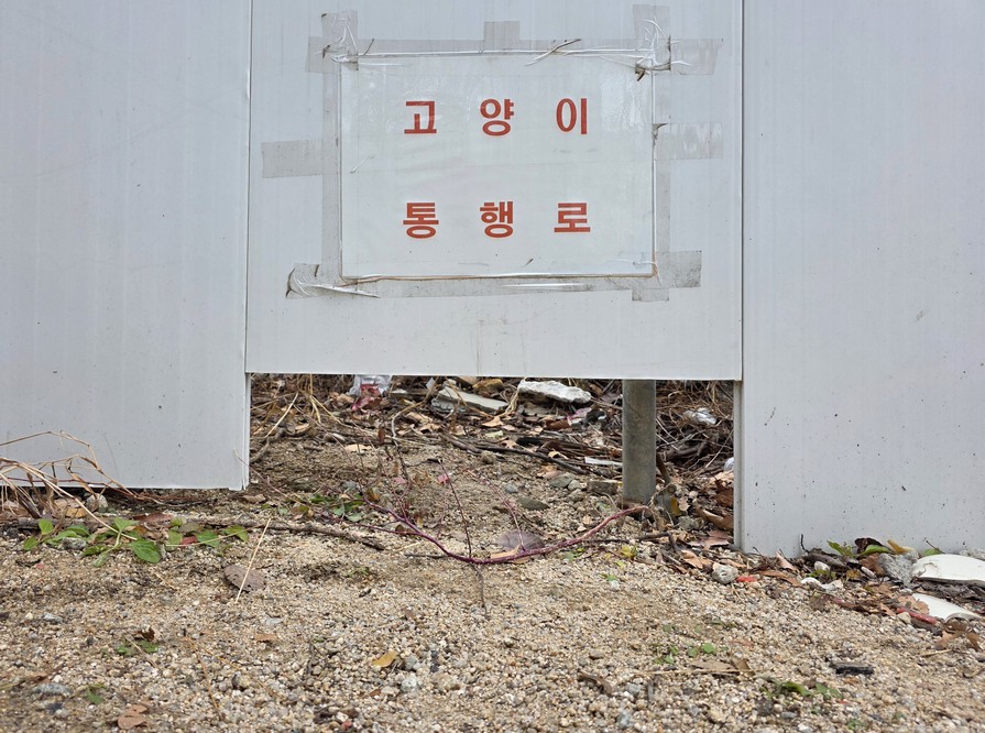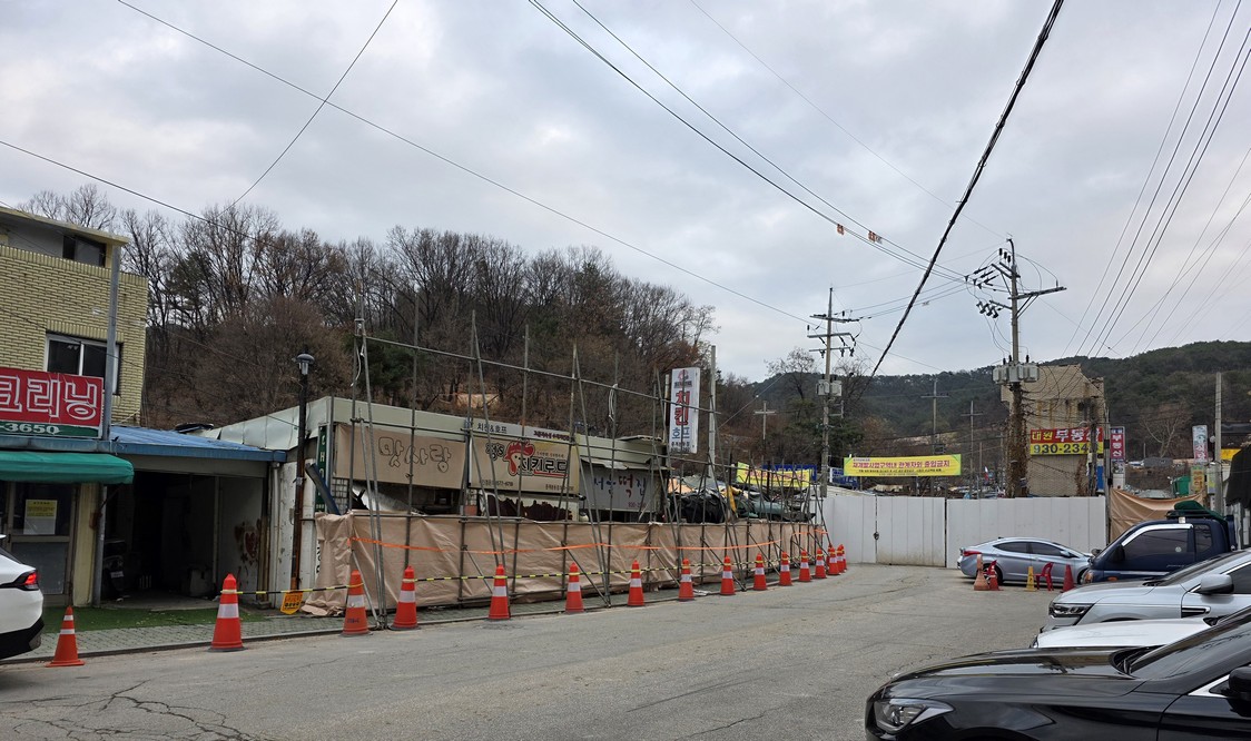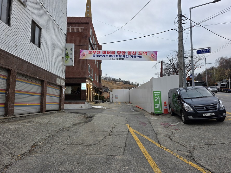 In the other direction, what appears to be the main gate to the construction area is straight ahead. Also, there's still a trendy-looking cafe in the building on the left.