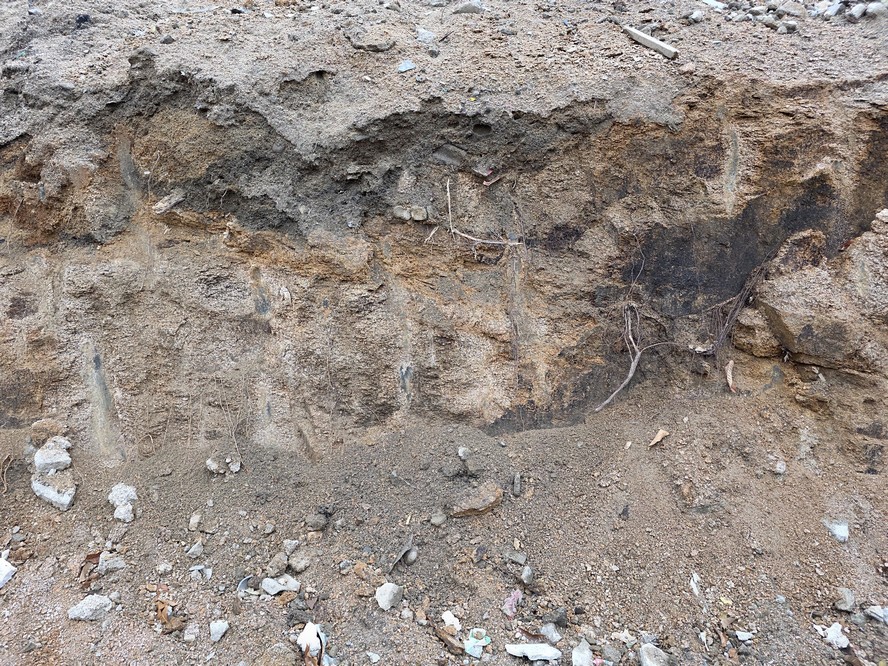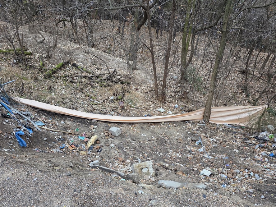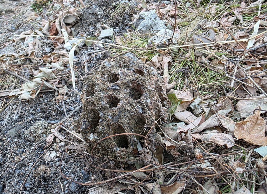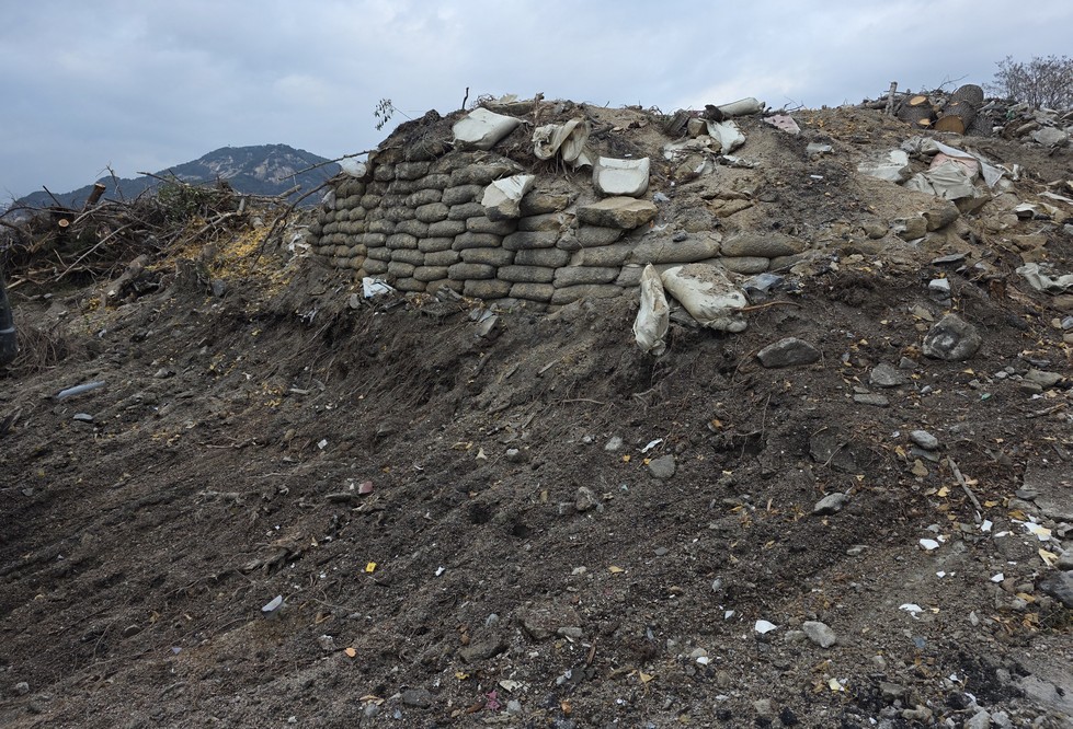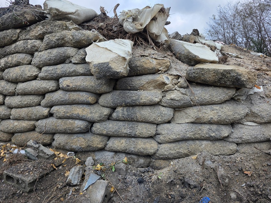 This wall appears to be made with hardened bags of maybe concrete stacked on top of each other.