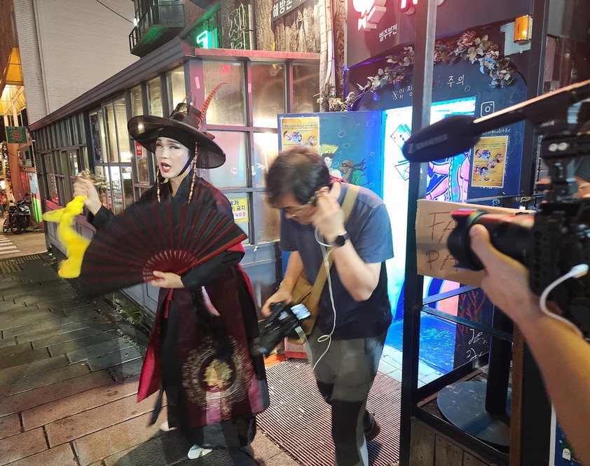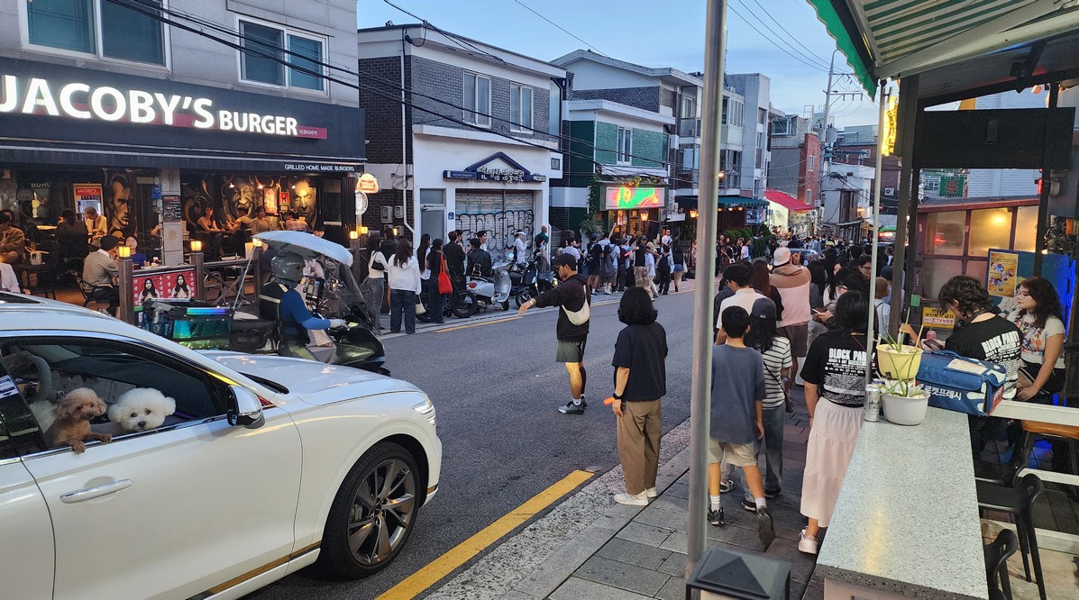 On my way to HBC, traffic was backed up pretty bad. I saw they had the barricades out again. And there was loud music, live. As I drove past, I found the Yangbans performing right next to the street. I drove back and forth a few times, then stopped to watch.