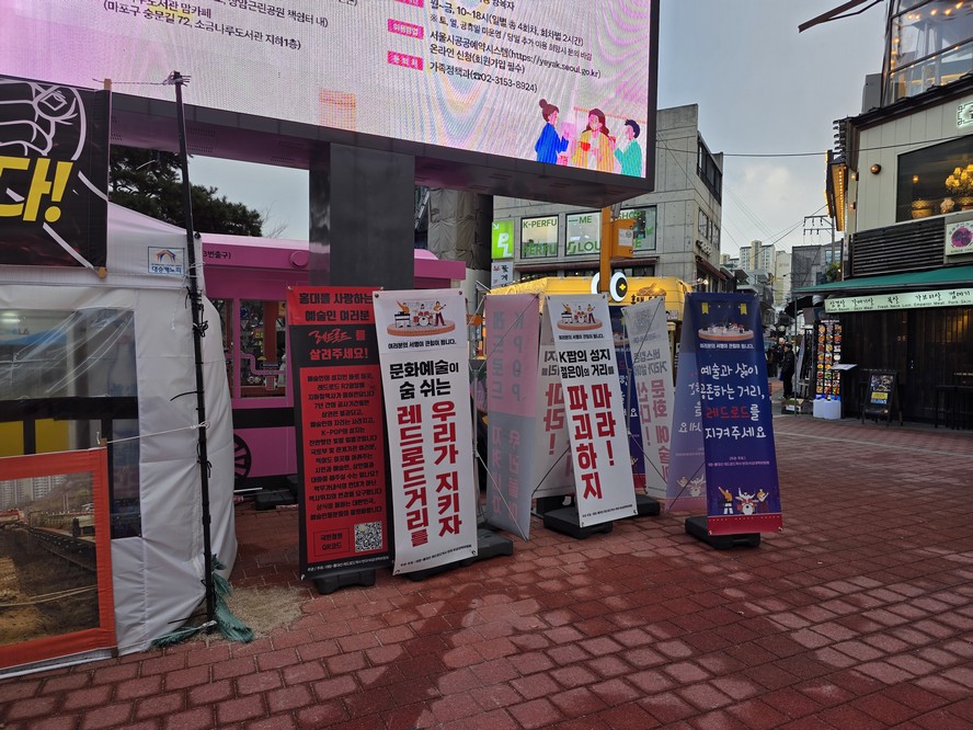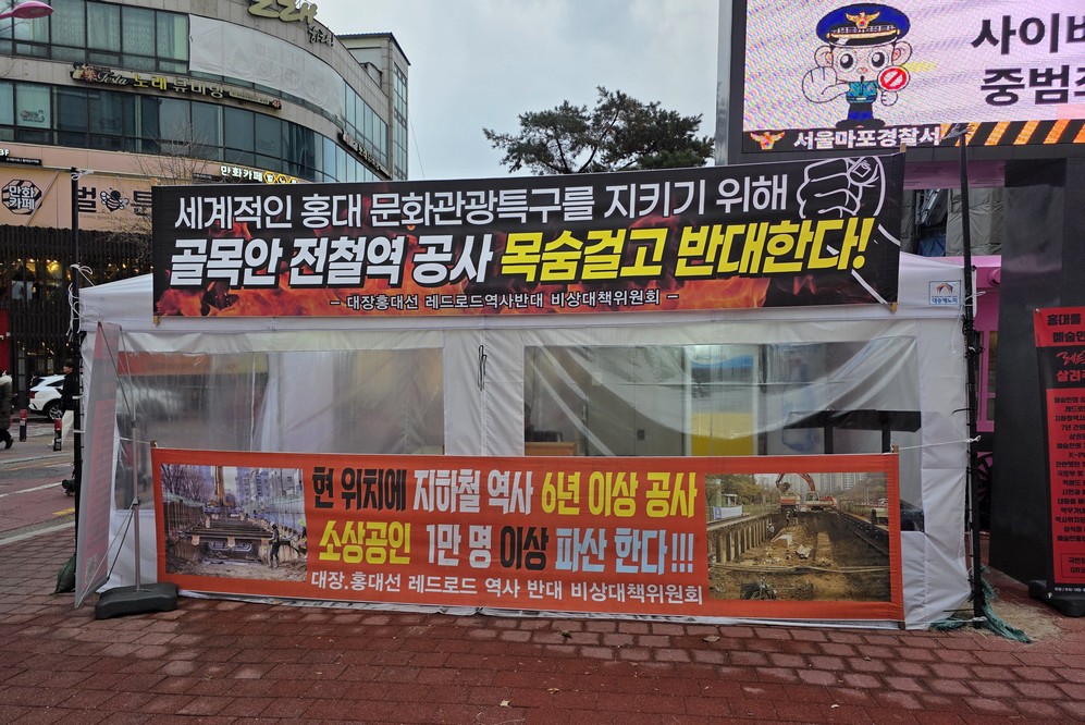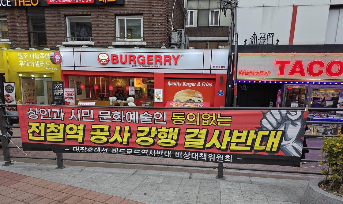 We went by the site where they're going to build a train station. The banner is part of a protest.