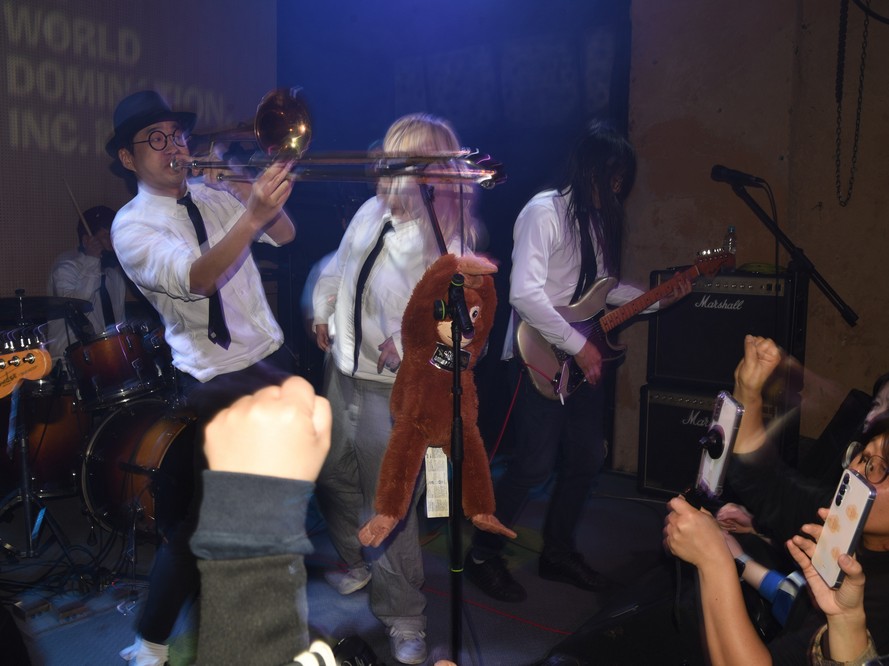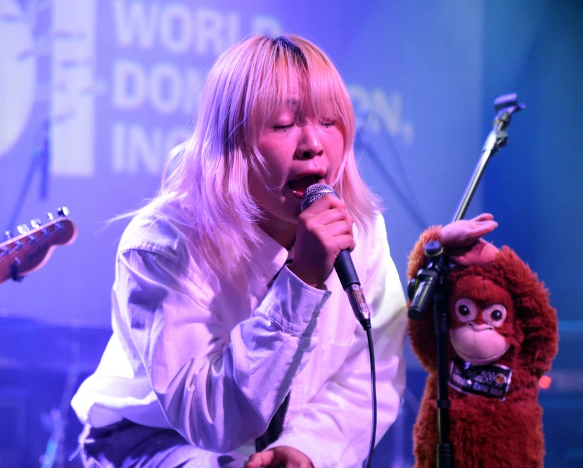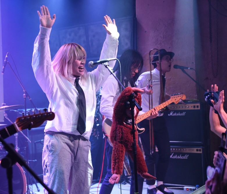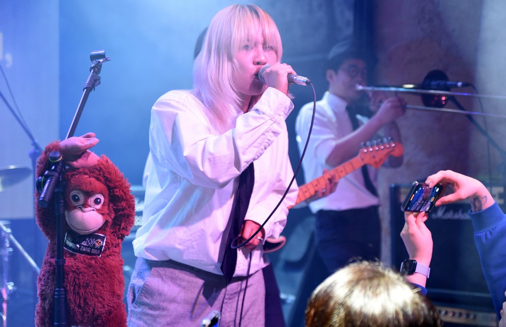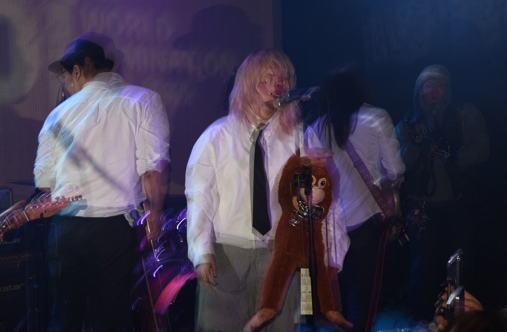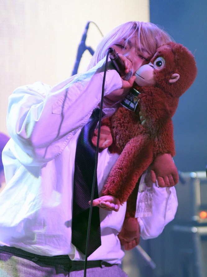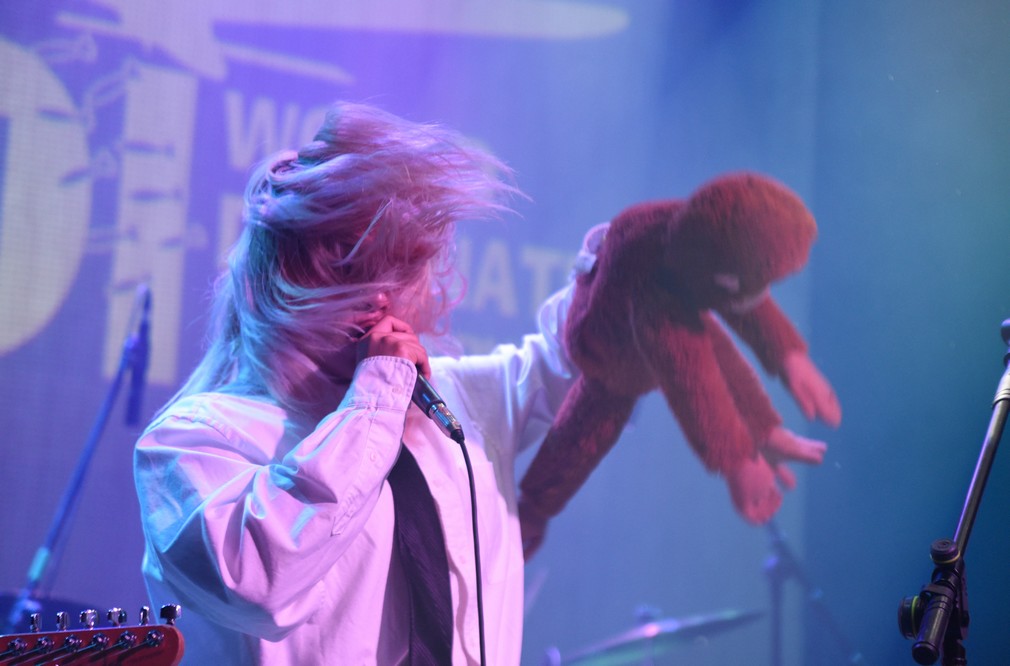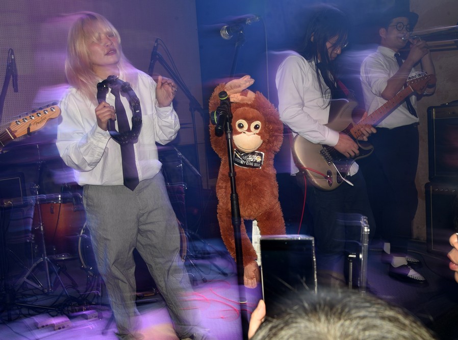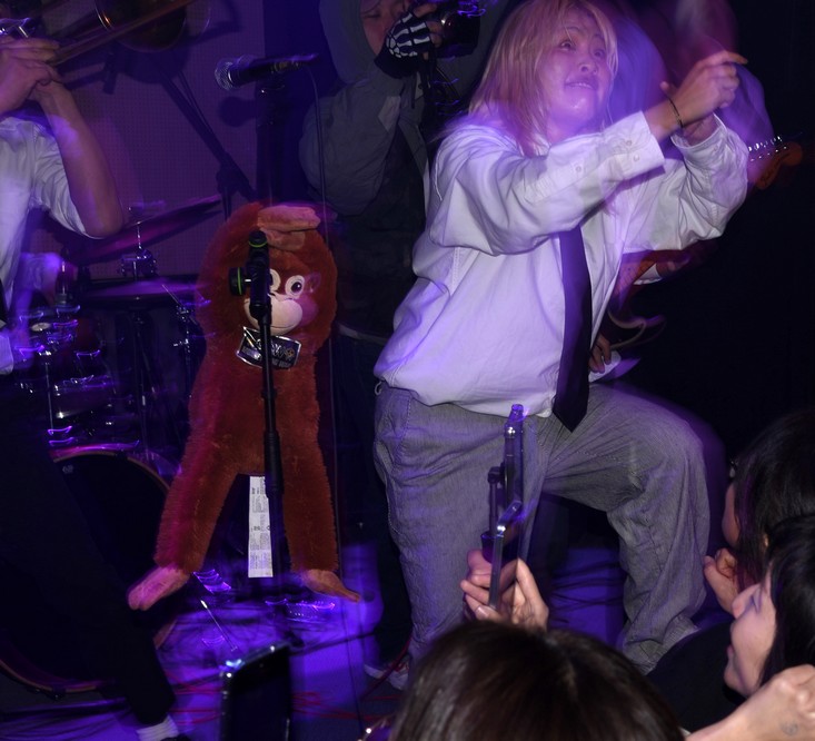 The monkey fell off the mic stand and Trash started playing with it.