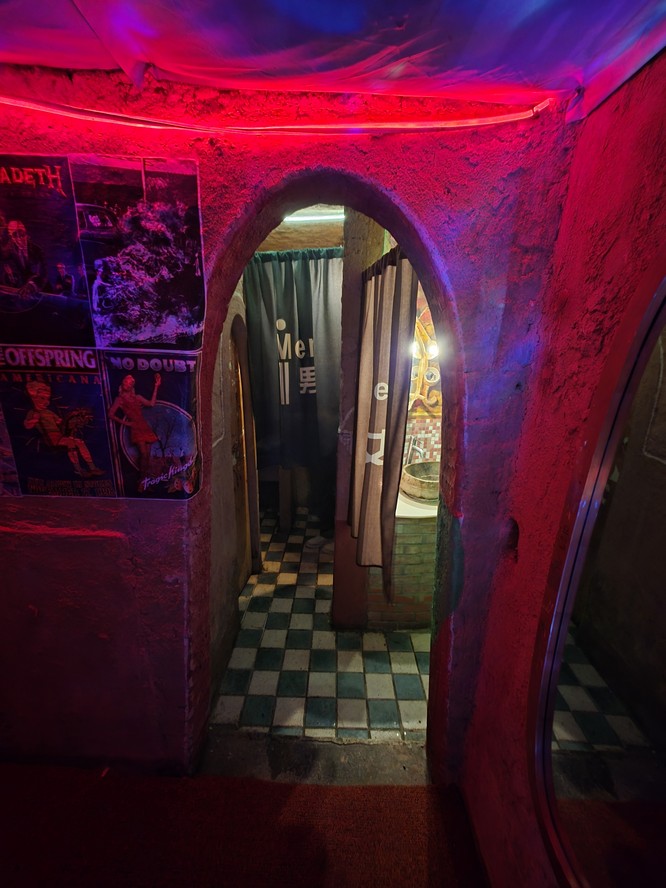 Wandering into the washroom.