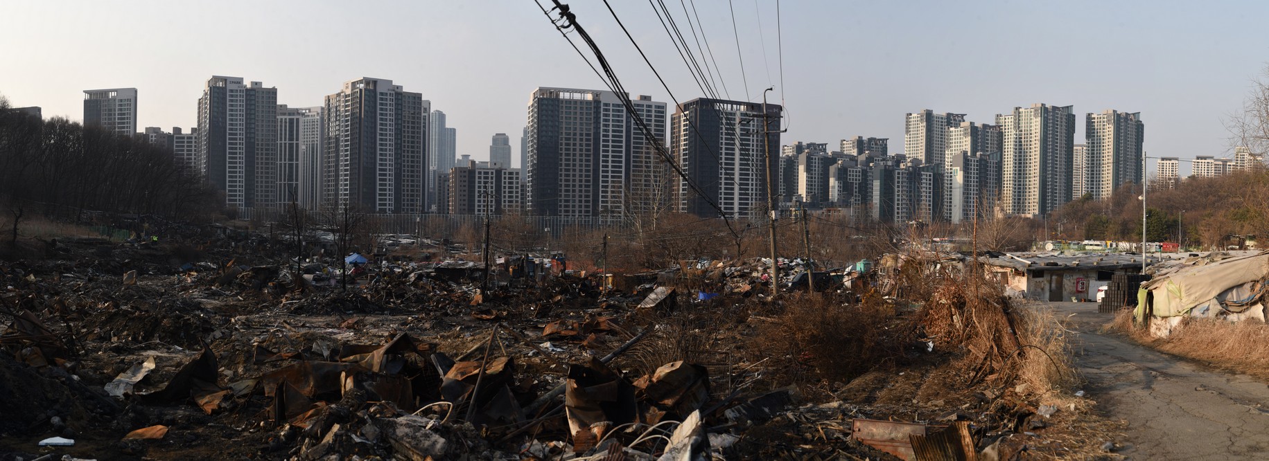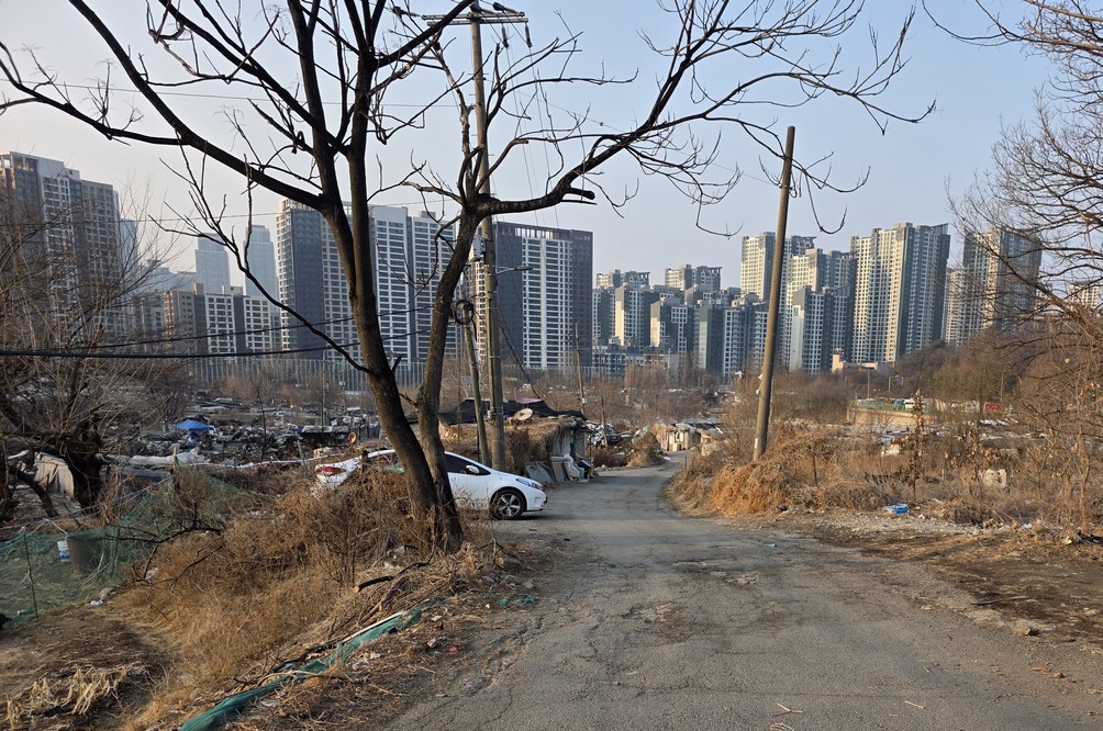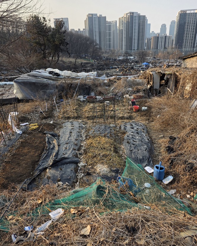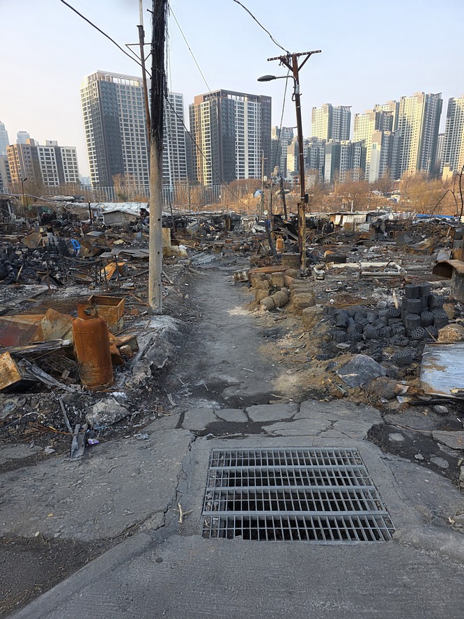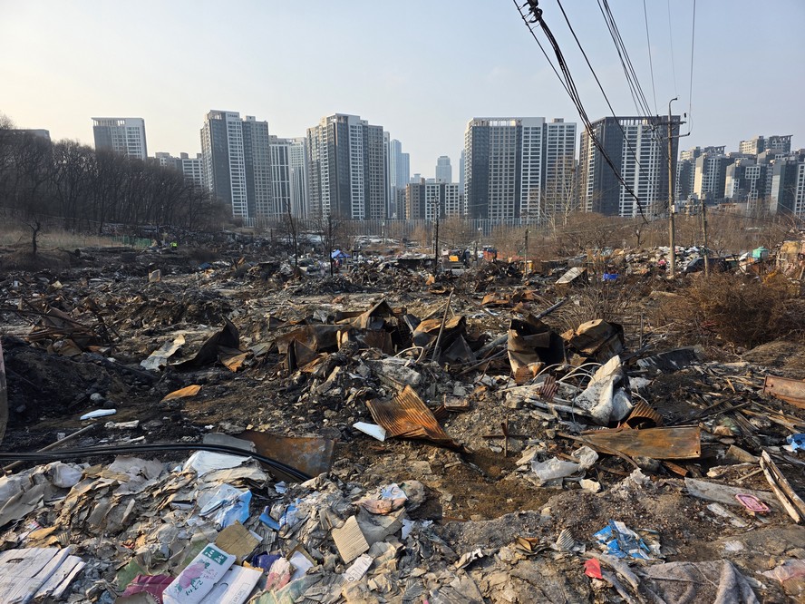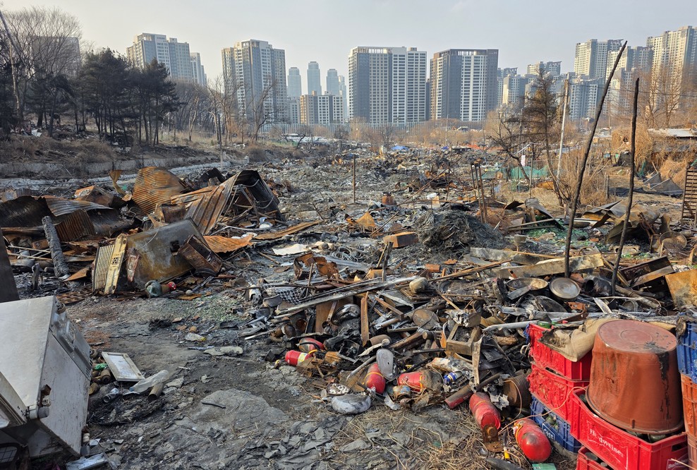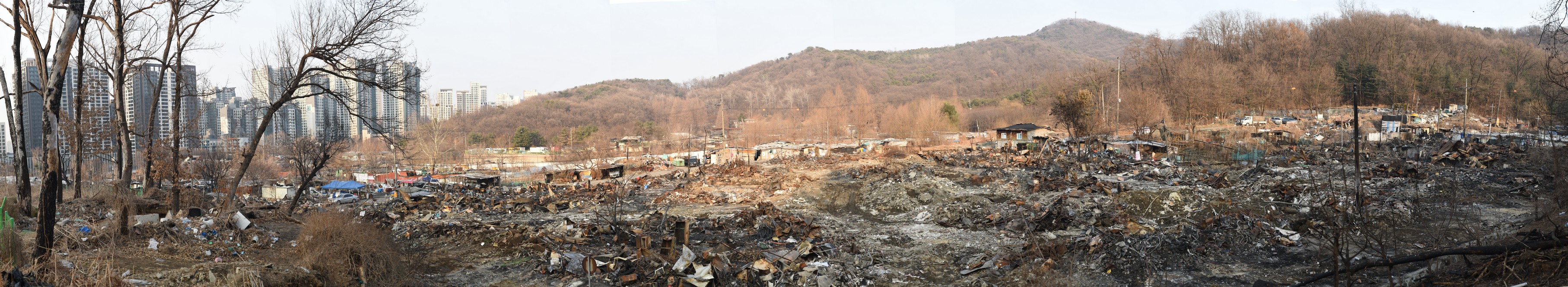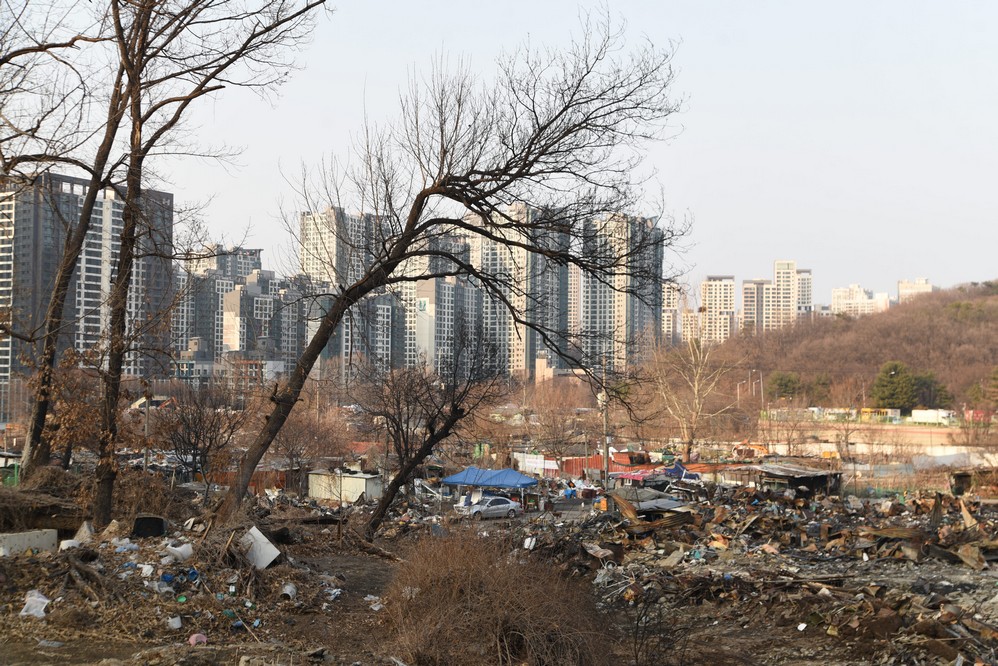A view looking over the wreckage toward the heavily developed skyline of Gangnam to the north.