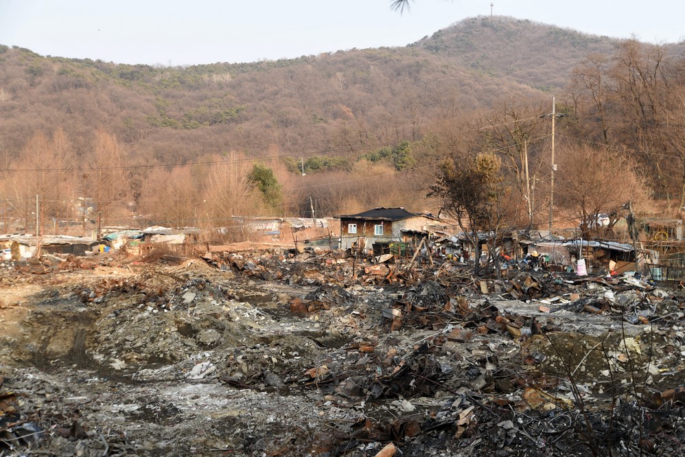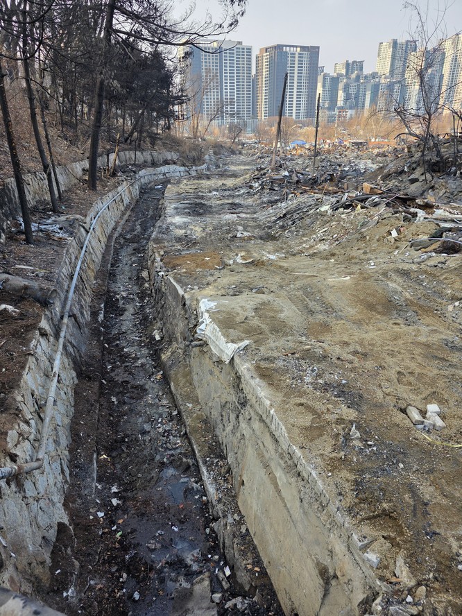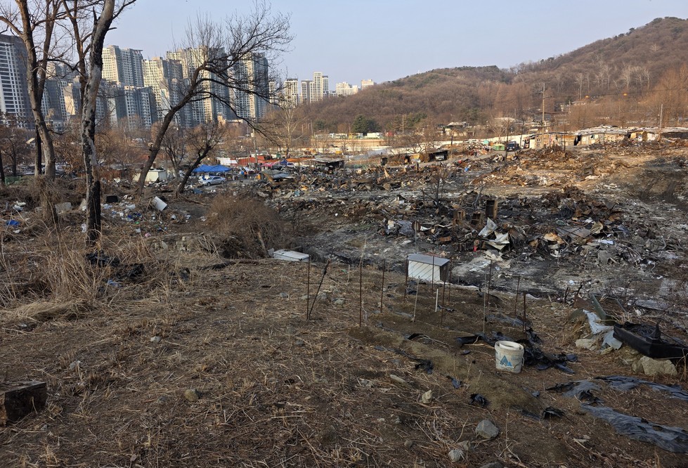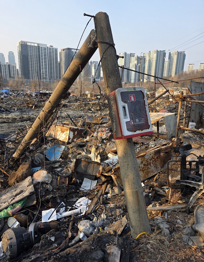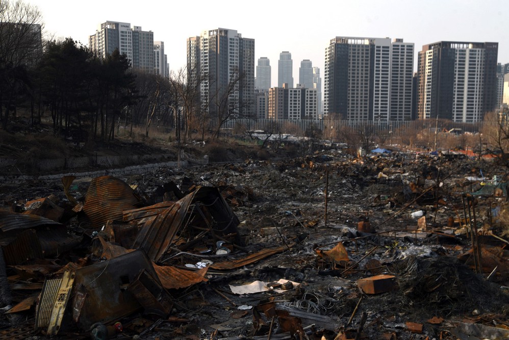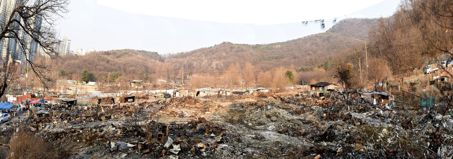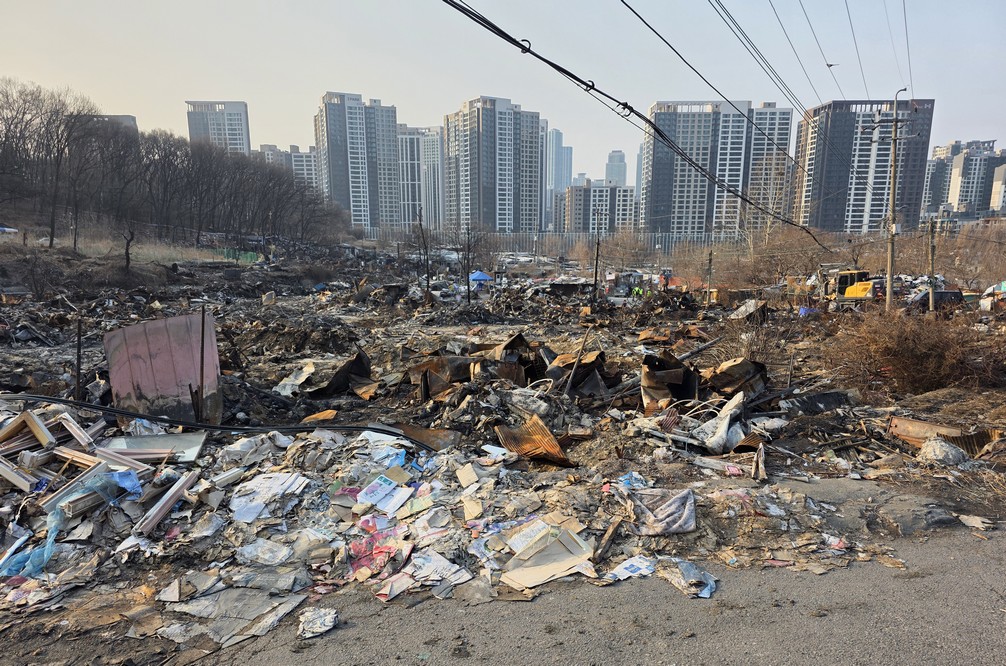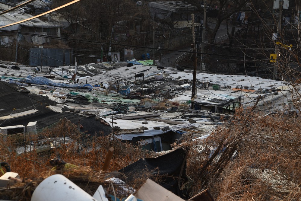 A view looking over the wreckage toward the heavily developed skyline of Gangnam to the north.