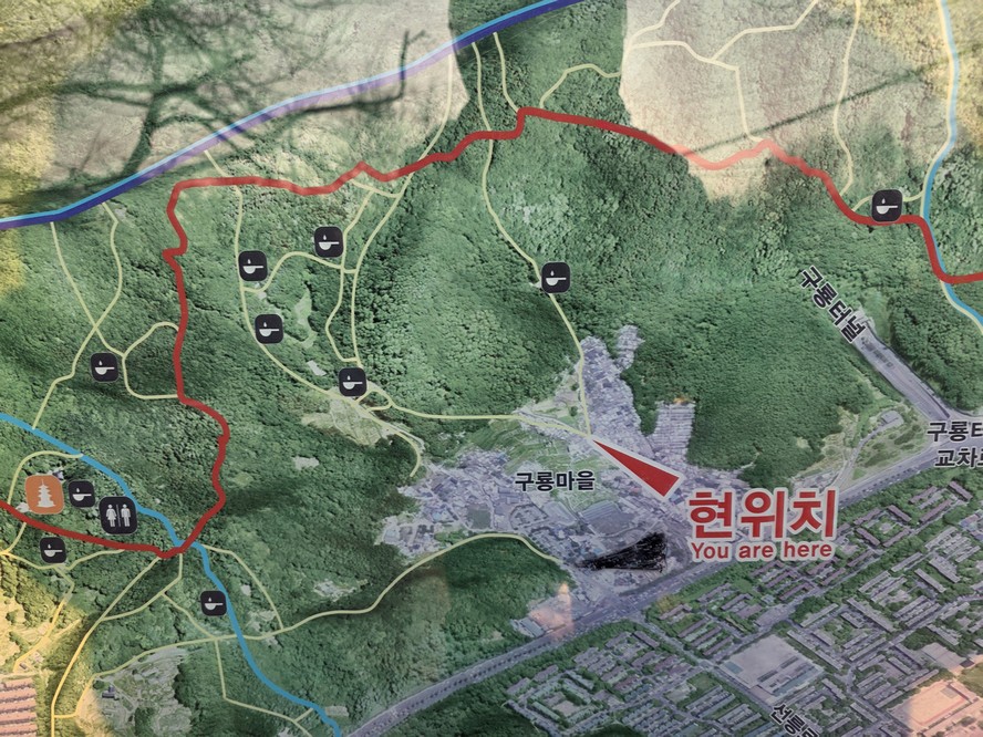 This is how detailed it gets here. I suspect the black arrow pointing left is a better reflection of where I found this sign. Note how Guryong Village leads to many trailheads on the mountain behind it.