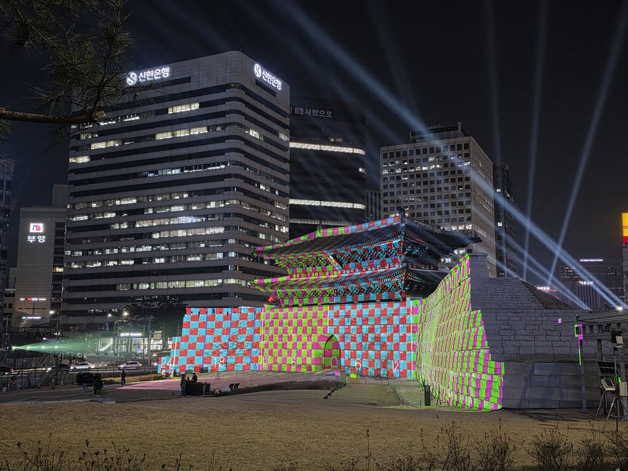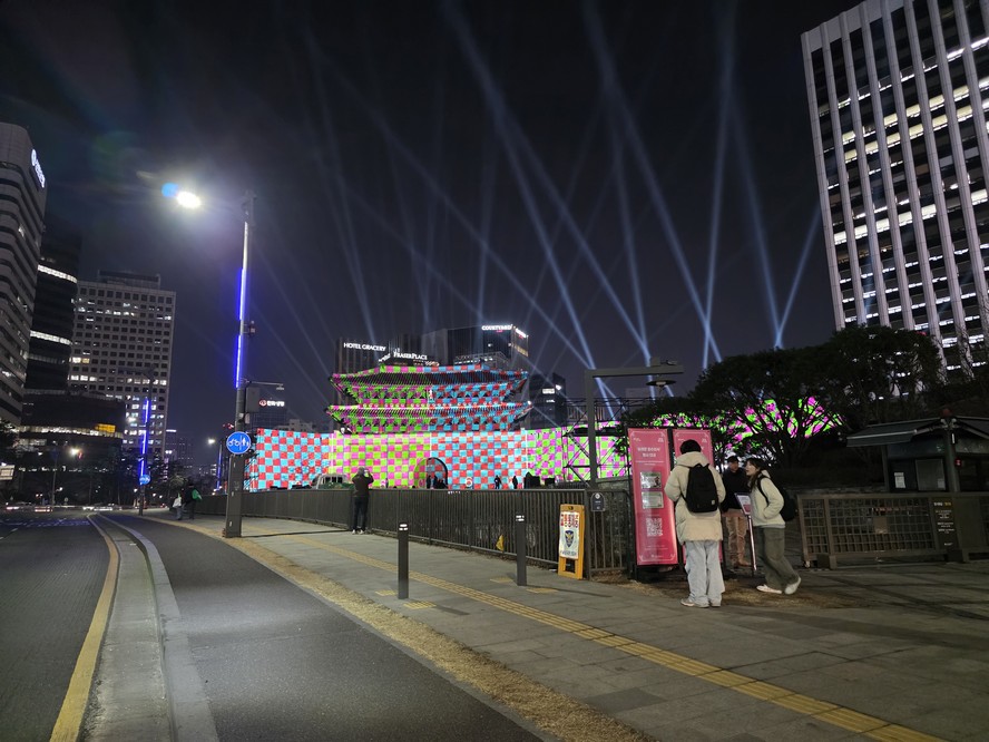 The gate is lit up, presumably for the BTS concert.