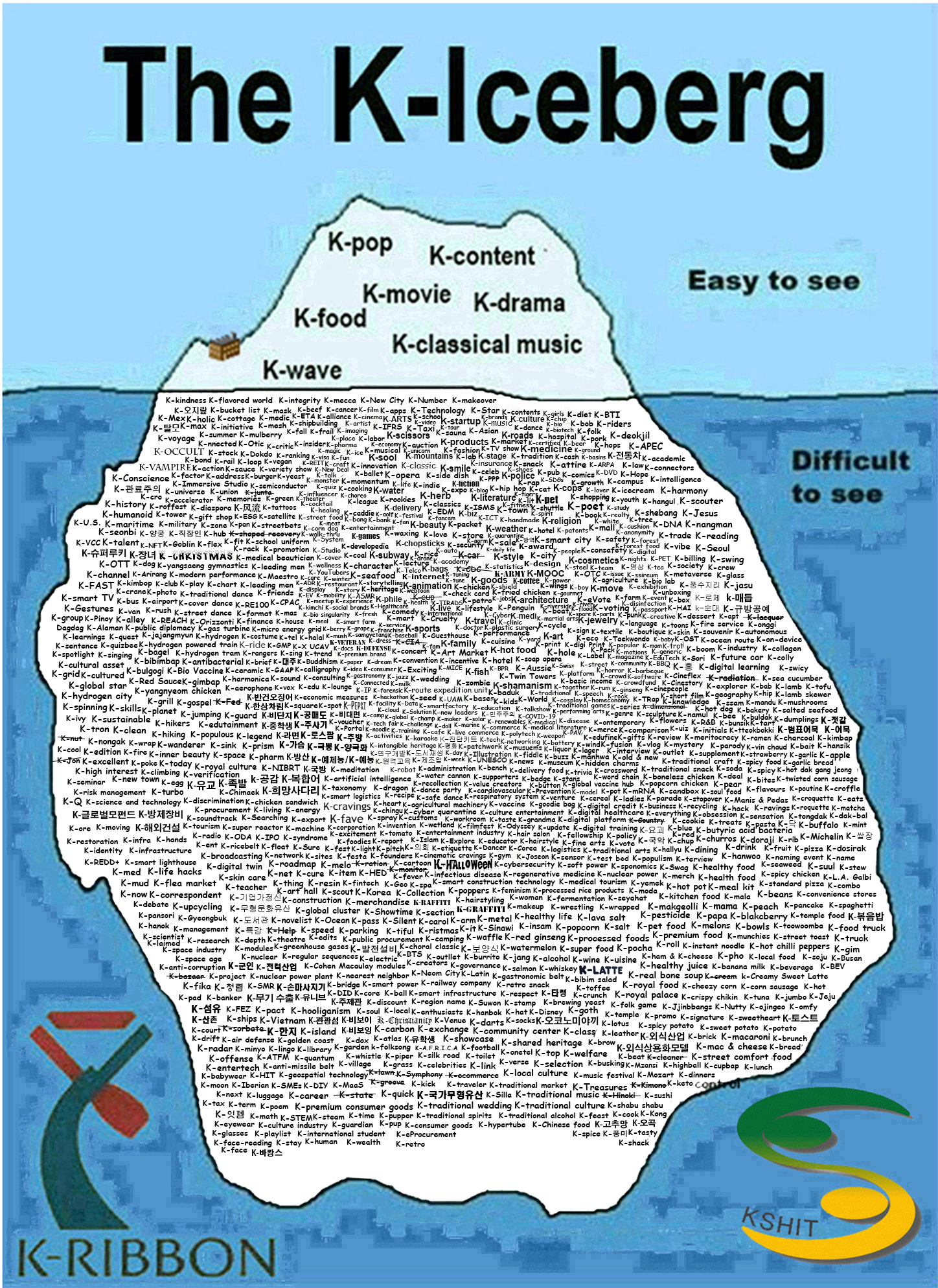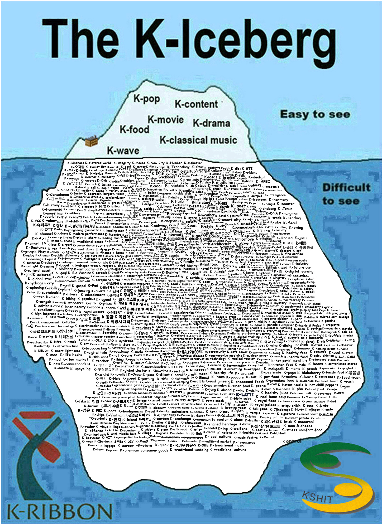To qualify for the K-Iceberg, the term must be put in use by a notable enough source, preferably a government agency, but others include private companies, artists, and celebrities. It does not include K-pop fan sites, which would include Knetizen (which notably doesn't hyphenate "Kpop"), K-craze and the K-grammar lessons on the "Learn Korean Through K-POP" website. I'm also trying to avoid journalists and academics coining the terms to talk about what they study, such as K-spaces,