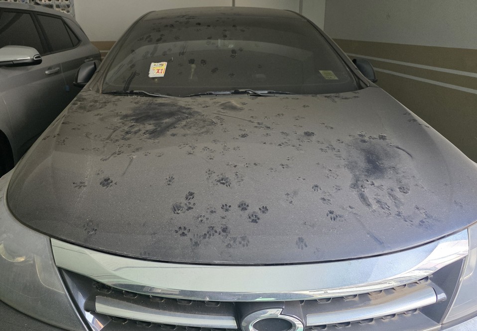 There were two vehicles parked in the parking garage of my building that had been there so long that they picked up a lot of cat traffic. I took a few photos to record the damage, which shows not just paw prints but also what appear to be spots where a cat or cats just laid down. All the power to them.